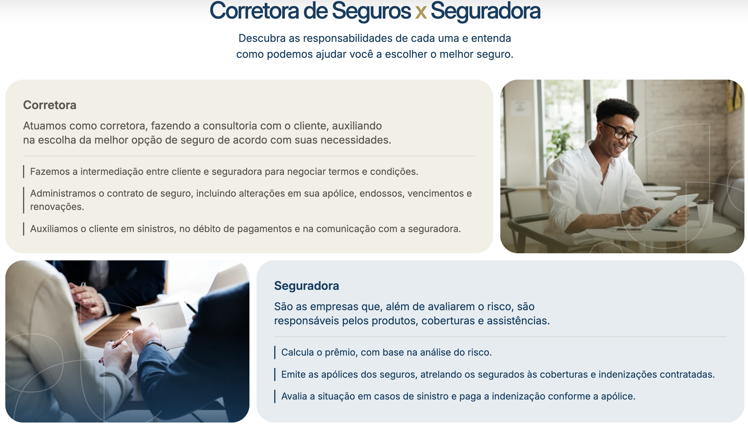 Fundada por William Américo e Bruno Saladim, executivos com décadas de experiência na Porto Seguro, uma das maiores e mais sólidas seguradoras do país. Essa trajetória nos permitiu conhecer profundamente o mercado de seguros por dentro: produtos, processos, estrutura das seguradoras, gestão de sinistros e principalmente, as dores reais de empresas e pessoas no momento em que mais precisam do seguro.
